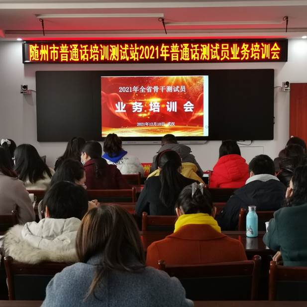 12月10日,全省普通话水平测试员骨干培训会在雄楚国际大酒店举行。因疫情防控原因,培训采用线上与线下相结合的方式进行。武汉地区测试站每站选派一位在聘骨干测试员参加线下培训,各测试站组织在聘骨干测试员和在聘的优秀测试员参加线上培训。许多测试站组织全体测试员参加线上培训,仙桃市、随州市、汉江师范学院等测试站还组织了分会场。培训会由湖北省普通话培训测试中心办公室主任龙莉主持,湖北省普通话培训测试中心常务副主任董中锋讲话,国家级测试员王金芳、肖劲松副教授分别对字词、说话部分的培训作了讲解,湖北广播电视台播音指导马力、冯悦对短文朗读部分作了示范分享。