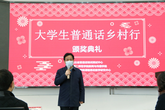 3月24日,“大学生普通话乡村行”颁奖典礼在湖北第二师范学院举行。湖北省普通话培训测试中心常务副主任主任董中锋,湖北第二师范学院新传学院院长陈瑛、书记徐晓、副书记邱媛参加活动,陈欣副院长主持,教师及获奖学生代表参加。