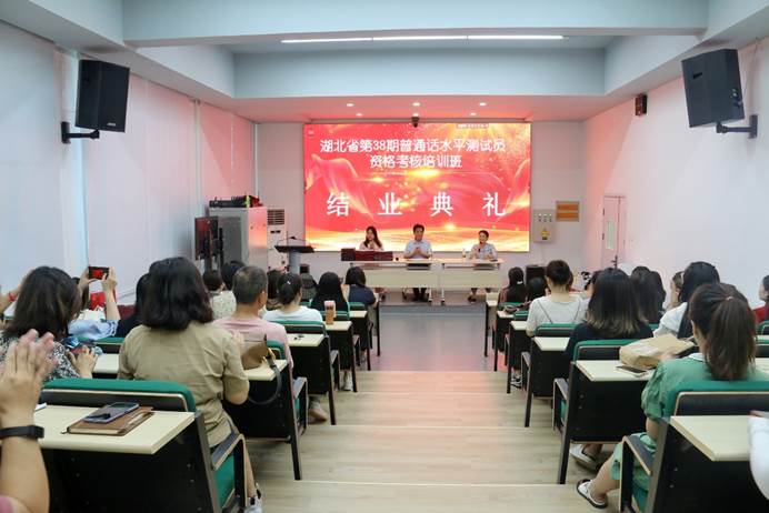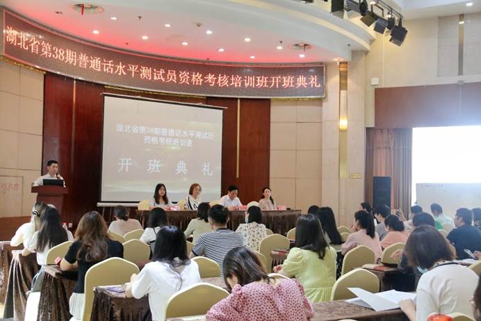 6月21日至30日,湖北省第38期普通话水平测试员资格培训班在华中师范大学桂苑宾馆举办。湖北省语委办副主任刘丽萍、湖北省普通话培训测试中心常务副主任董中锋、部分任课教师以及测试中心其他人员参加开班仪式。来自全省各地的48名学员进行培训,经过考核,41人获得省级测试员资格证书。