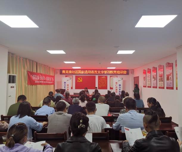 随后,推普团队来到青龙泉社区会议室,围绕“村民常用语50句”,认真地教读、正音,耐心地纠正发音,为社区120余名群众上了一堂精彩实用的语言文字课,同时还向在场群众发放了“普通话乡村行”宣传册,积极向社区群众推广普通话知识。